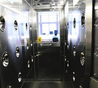 在进成表装配车间前,要先经过一间像电梯间的密闭小屋子。这个是风淋室。风淋室welcome彩票是进出成表装配间的必经通道,目的是减少人员进出所带来的大量尘埃粒子。大家看这个像不像电梯间,只是墙上多了一些像喇叭样的喷嘴出风口。