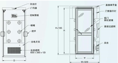 风淋室由大箱体(风机、过滤器安装于此箱体内)、小箱体(双吹风淋室此侧安装喷嘴,数量与大箱体一致、顶板(安装内嵌式照明灯)、内底板(不锈钢砂板)、风淋室双门体与其它配件:过滤器,风机,智能电路板,喷嘴,照明灯等组成。