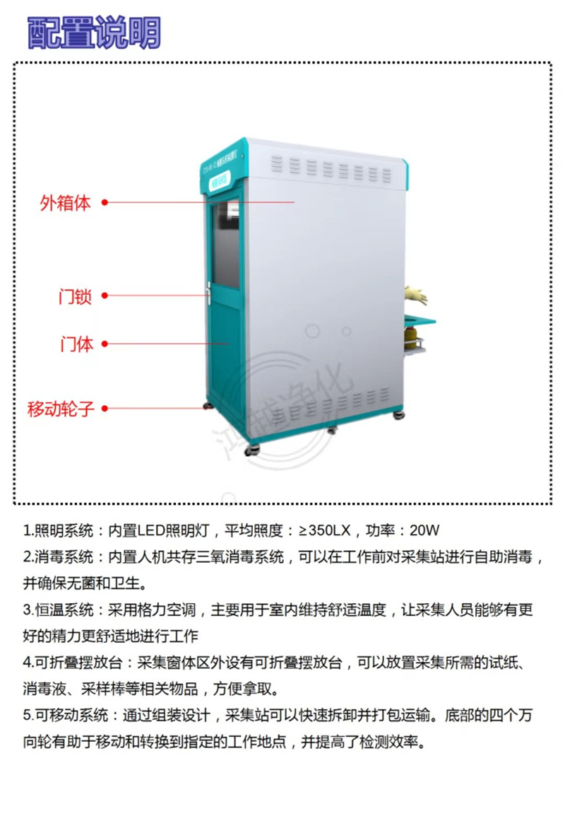 1.消毒系统:内置人机共存三氧消毒系统,可以在工作前对采集站进行自助消毒,