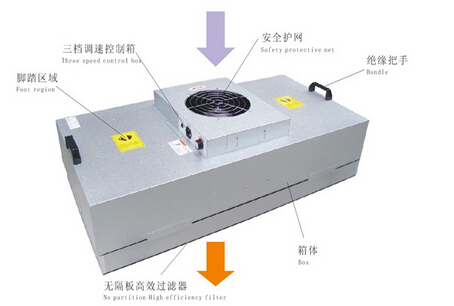FFU既是风机过滤单元的简称,它是一款自带动力的过滤净化装置。主要是有风机和高效过滤器组合而成的末端净化设备,其主要工作过程是:由空调处理机把空气(新风)处理成所需要的状态点后送入静压箱与回风混合,再经过FFU的风机加压后经过高效过滤器(HEPA)或超高效空气过滤器(ULPA)过滤后送入无尘室内;而原本的旧风则经过架空地板或者侧墙输送回到干盘管,在干盘管中经过冷(热)处理后,再由回压机送回到静压箱,这便完成整个无尘室空气过滤的循环。这样的系统最常应用在对无尘室有超静需求的场所,例如制作大型集成电路晶圆、TFT显示器、固态硬盘等等的无尘车间。这里优之净跟大家讲讲FFU最主要的特点:
